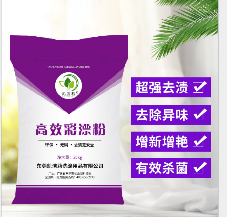 彩漂粉氧化性適中不會使彩色織物氧化褪色,使有色織物增艷,白色織物增白。對汗漬、奶漬、血漬、植物基污斑色素,具有特殊的去除能力,并具有消毒,滅菌功能,可洗滌床單、毛巾、窗簾、衣物等。適用范圍廣,對棉、麻、毛、絲及化纖各種顏色的織物均可適用。